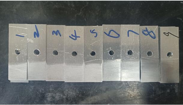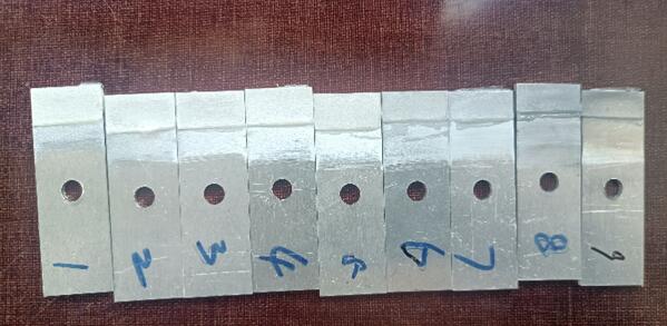 我們選取的砂布目數(shù)為:60、120、180、320、600、800、1200、1500、2000。我們分別按1-9給這個試片進行排序。1代表60目,2代表120目...,我們能從打磨痕跡看出,號數(shù)越大的,打磨越細膩,1500和2000目砂紙打磨的硬鋁試片基本能呈現(xiàn)出鏡面光澤。(下面的圖片拍攝可能是反光問題,不能看出差異,實物實際是很能看出來區(qū)別的,不信你試試,哈哈)