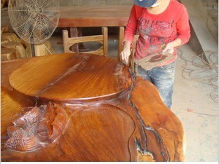 大板(柚木、花梨木、雞翅木、檀木等)在修補前,首先應(yīng)將大板里的水分風(fēng)干,好把木材內(nèi)的含水量控制在6%-12%之內(nèi),并且要將有縫隙和裂紋處的泥沙木屑清理干凈再進(jìn)行灌膠或涂膠修補,如果裂縫處底部是相通的,則需要將底部先堵住,待補完膠再打磨掉。這樣修補出來的成品才相當(dāng)平整和美觀.